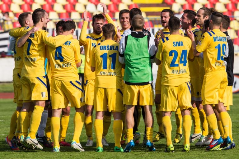Hráči Myjavy sa tešia po zápase 26. kola Corgoň ligy 2013/14 medzi ŠK Slovan Bratislava a Spartak Myjava. Foto: SITA/Jozef Jakubčo