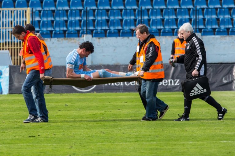 Hráč Slovana Nicolas Gorosito (na nosidlách) počas zápasu 26. kola Corgoň ligy 2013/14 medzi ŠK Slovan Bratislava a Spartak Myjava. Foto: SITA/Jozef Jakubčo