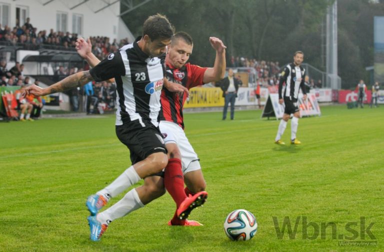Zľava: Erik Daniel zo Spartak Myjava a Matúš Čonka z FC Spartak Trnava v zápase 9. kola futbalovej Fortuna ligy 2014/15 medzi Spartak Myjava - FC Spartak Trnava. Myjava, 12. september 2014. Foto: SITA/Martin Medňanský