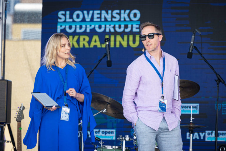 Zľava: Moderátori podujatia Veronika Cifrová Ostrihoňová a Matej Sajfa Cifra počas Dňa otvorenej diplomacie na Ministerstve zahraničných vecí a európskych záležitostí SR. Bratislava, 17. jún 2023. Foto: SITA/Jana Birošová