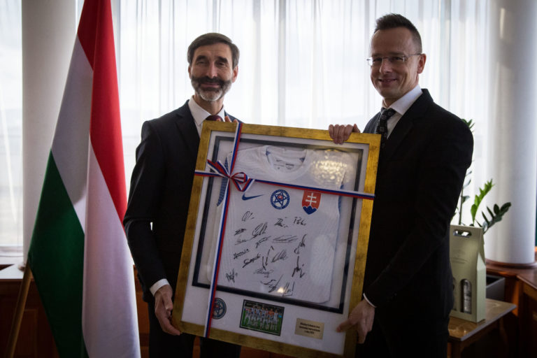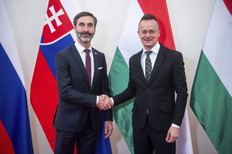 Zľava: Minister zahraničných vecí a európskych záležitostí SR Juraj Blanár a maďarský minister zahraničného obchodu a zahraničných vecí Péter Szijjártó počas stretnutia v Budapešti pri príležitosti oficiálnej návštevy ministra zahraničných vecí SR v Maďarsku. Maďarsko, Budapešť, 20. december 2023. Foto: SITA/MZV
