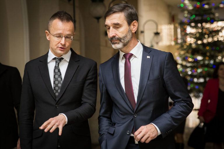 Maďarský minister zahraničných vecí a obchodu Peter Szijjártó (vpravo) si podáva ruku so slovenským ministrom zahraničných vecí a európskych záležitostí Jurajom Blanárom počas ich stretnutia v Budapešti. Maďarsko, Budapešť, 20. december 2023. Foto: Zoltan Balogh/MTI via AP