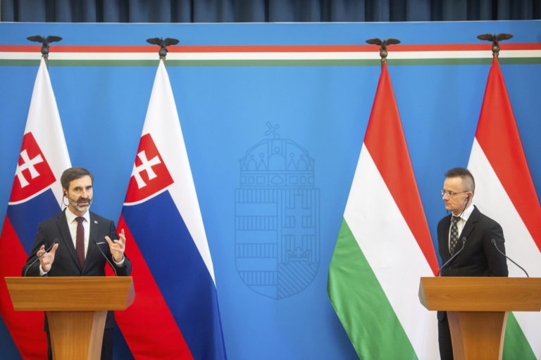 Zľava: Minister zahraničných vecí a európskych záležitostí SR Juraj Blanár a maďarský minister zahraničného obchodu a zahraničných vecí Péter Szijjártó na spoločnej tlačovej konferencii. Maďarsko, Budapešť, 20. december 2023. Foto: Zoltan Balogh/MTI via AP