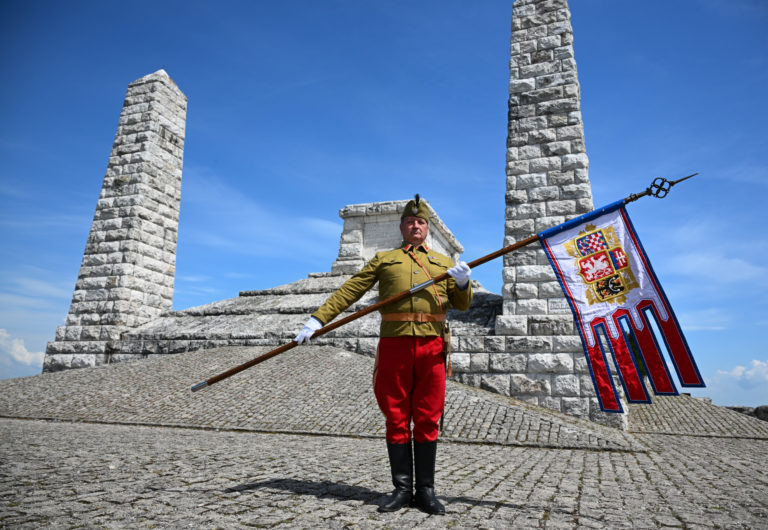 Návštevník v historickej uniforme počas celoslovenskej spomienky pri príležitosti 105. výročia tragickej smrti generála Milana Rastislava Štefánika na Mohyle Milana Rastislava Štefánika na Bradle. Brezová pod Bradlom, okr. Myjava, 4. máj 2024. Foto: SITA/Martin Medňanský.