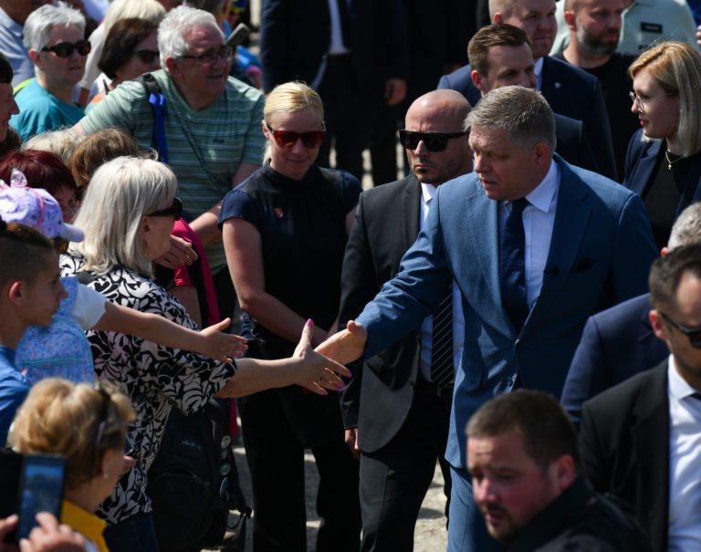 Predseda vlády SR Robert Fico (v popredí) počas celoslovenskej spomienky pri príležitosti 105. výročia tragickej smrti generála Milana Rastislava Štefánika na Mohyle Milana Rastislava Štefánika na Bradle. Brezová pod Bradlom, okr. Myjava, 4. máj 2024. Foto: SITA/Martin Medňanský