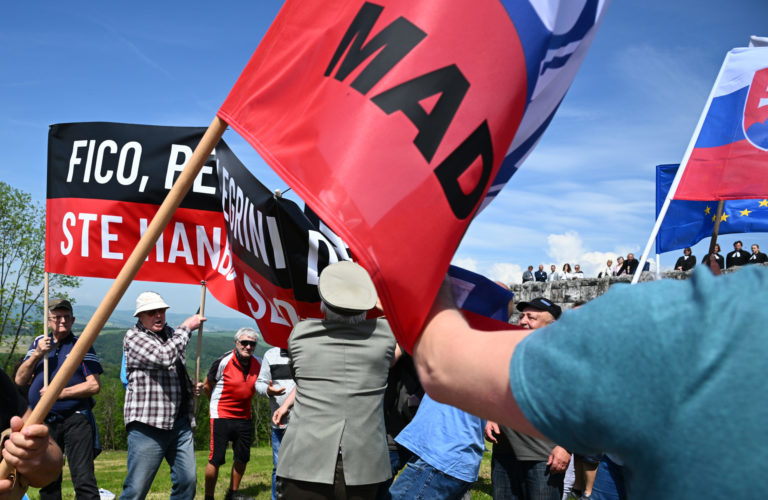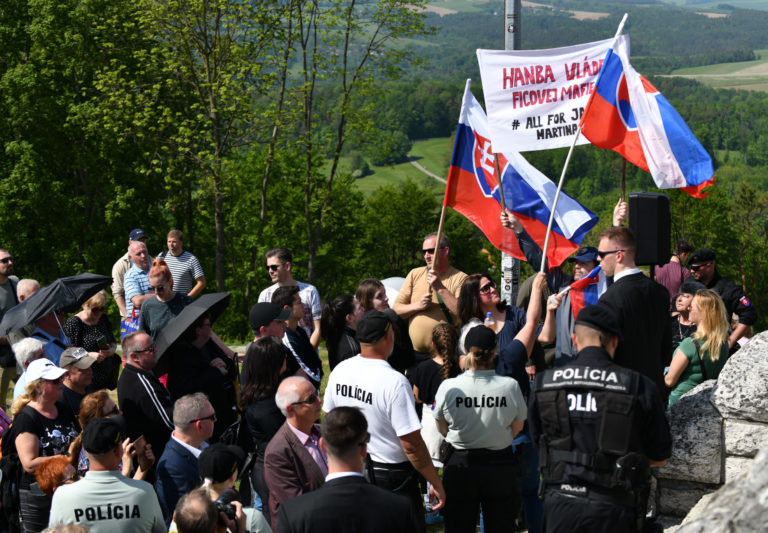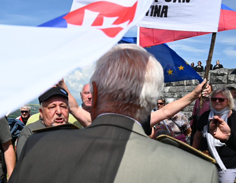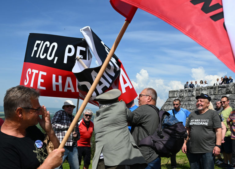Potýčka medzi návštevníkmi počas celoslovenskej spomienky pri príležitosti 105. výročia tragickej smrti generála Milana Rastislava Štefánika na Mohyle Milana Rastislava Štefánika na Bradle. Brezová pod Bradlom, okr. Myjava, 4. máj 2024. Foto: SITA/Martin Medňanský