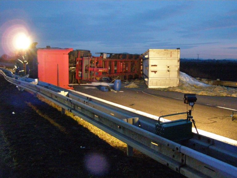 Mladý vodič poľského kamiónu najprv vrazil do zvodidiel. Tie sa dostali do protismeru a spôsobili ďalšie nehody. Foto: SITA/HaZZ Trnava