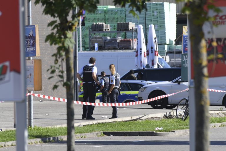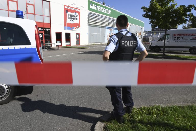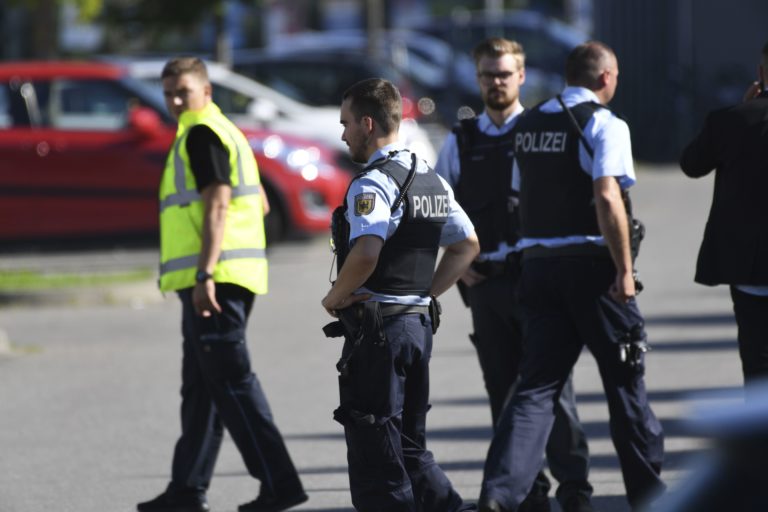 Hliadkujúci policajti pred diskotékou v meste Konstanz, kde sa strieľalo. Konstanz, 30. júl 2017. Foto: Felix Kaestle/dpa via AP.