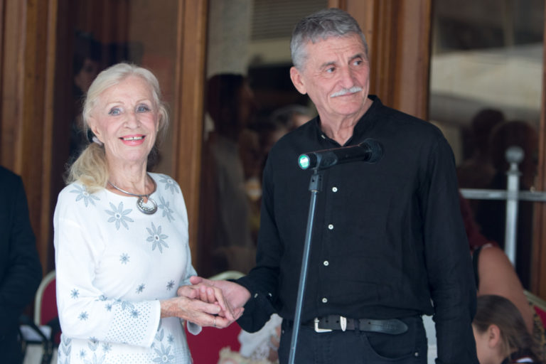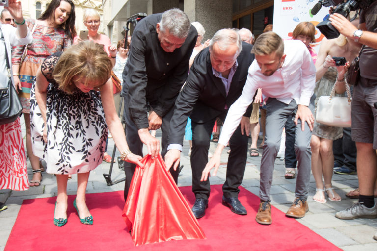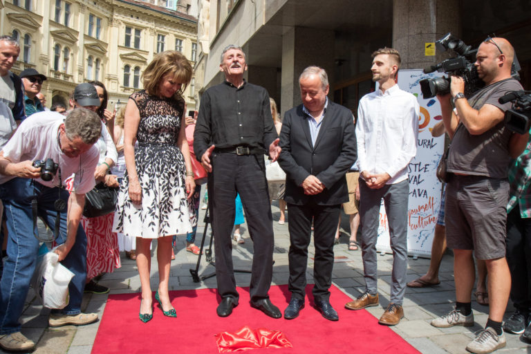 Divadelný a filmový herec Martin Huba a herečka Marína Kráľovičová počas odhalenia pamätnej dlaždice na Filmovom chodníku slávy pred bratislavským Mestským divadlom P. O. Hviezdoslava. Bratislava, 21. jún 2017. Foto: SITA/Ľudovít Vaniher
