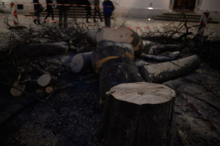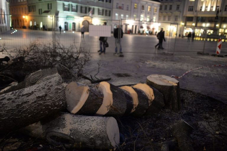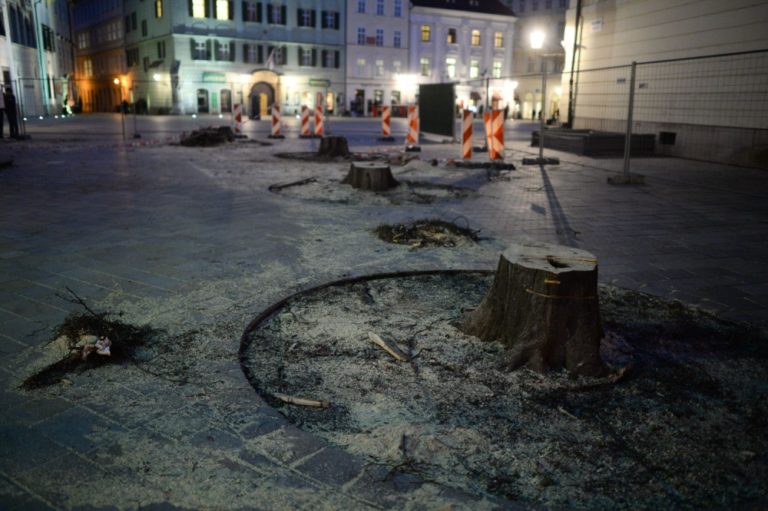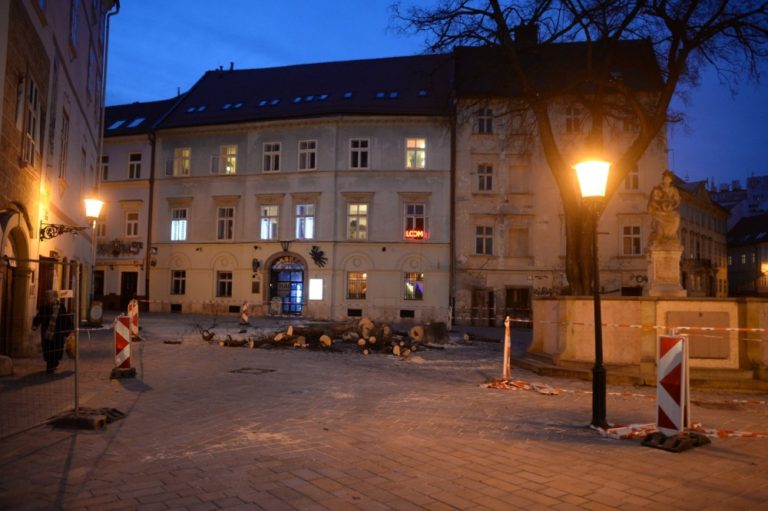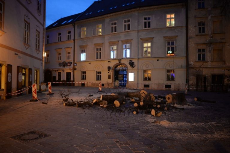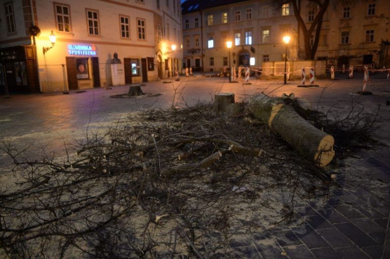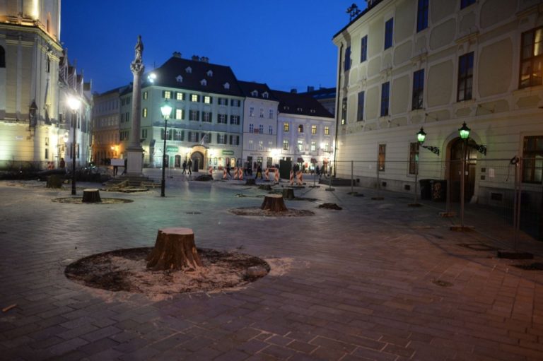 Pohľad na vyrúbané stromy na Františkánskom námestí. Namiesto nich radnica zasadí desať nových hrušiek ozdobných a na Hlavnom námestí pribudnú štyri nové lipy malolisté. Mesto ich vysadí v rámci projektu Bratislava sa pripravuje na zmenu klímy. Bratislava, 2. marec 2016. Foto: SITA/Urban Klement