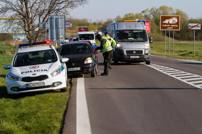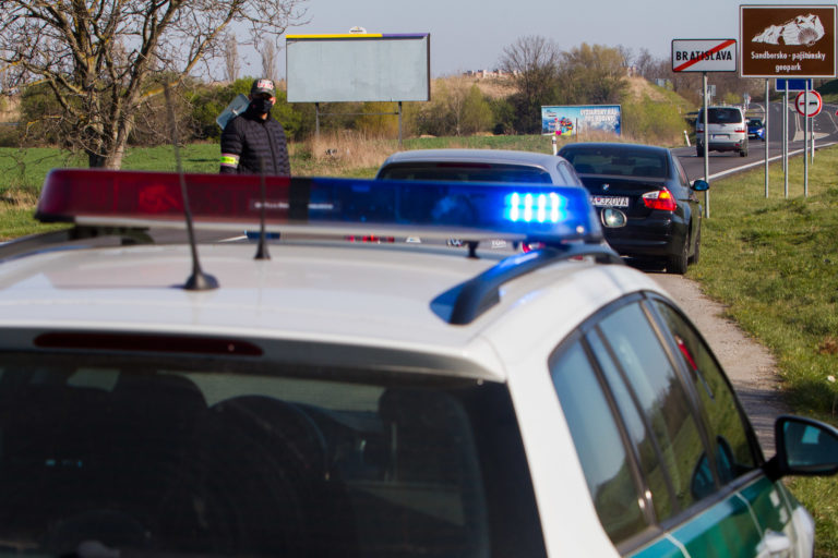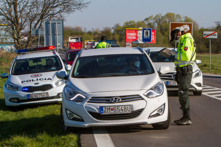 Policajt kontroluje vodiča na ceste zo Záhorskej Bystrice v smere do Stupavy počas mimoriadnej situácie, ktorú rozšírili o obmedzenia voľného pohybu osôb v rámci Veľkej noci od 8. do 13. apríla 2020 s cieľom nerozširovať ochorenie s COVID-19