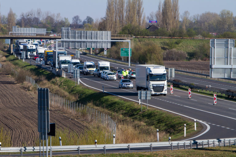 Kontrolné stanovište policajtov a kolóny nákladných a osobnných vozidiel na diaľnici pri Stupave v smere do Bratislavy počas mimoriadnej situácie.