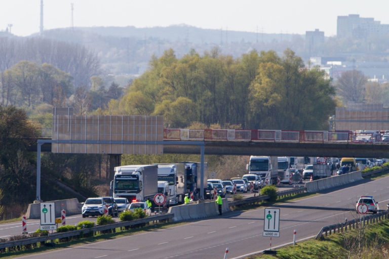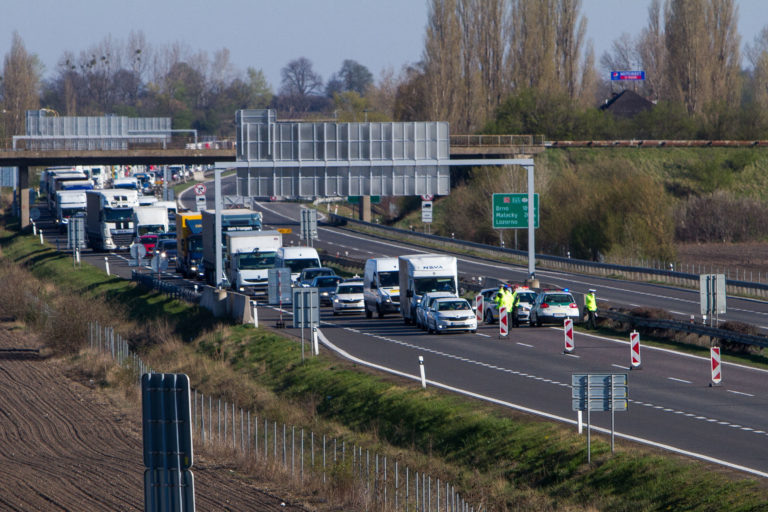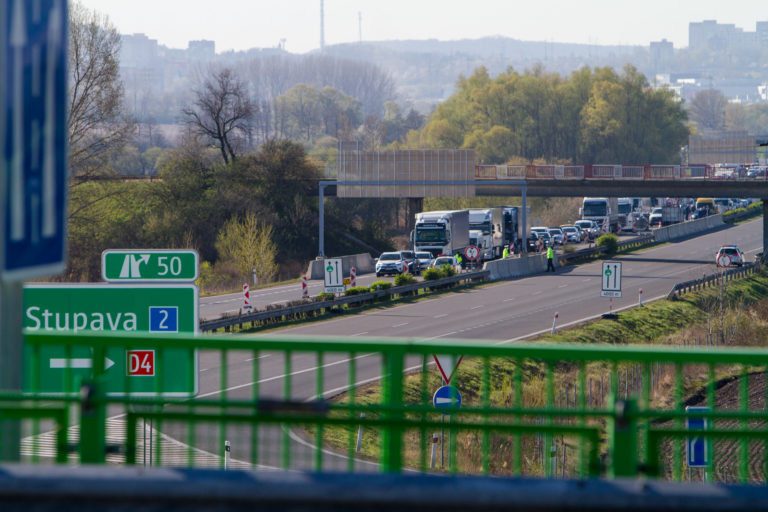 Kontrolné stanovište policajtov a kolóny nákladných a osobnných vozidiel na diaľnici D1 pri Stupave smerom na Brno počas mimoriadnej situácie, ktorú rozšírili o obmedzenia voľného pohybu osôb v rámci Veľkej noci od 8. do 13. apríla 2020 s cieľom nerozširovať ochorenie s COVID-19 spôsobené koronavírusom (2019-nCoV) na Slovensku. Bratislava, 8. apríl 2020. Foto: SITA/¼udovít Vaniher