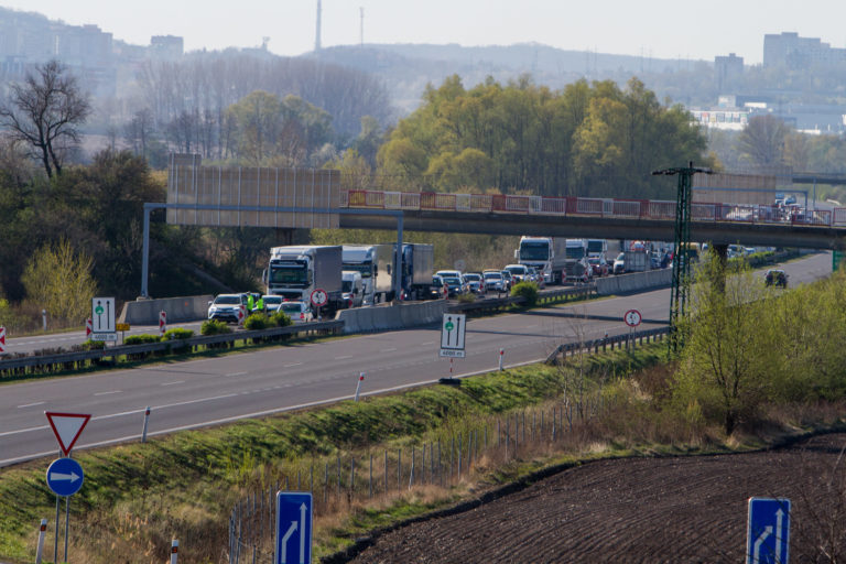 Kontrolné stanovište policajtov a kolóny nákladných a osobnných vozidiel na diaľnici D1 pri Stupave smerom na Brno.