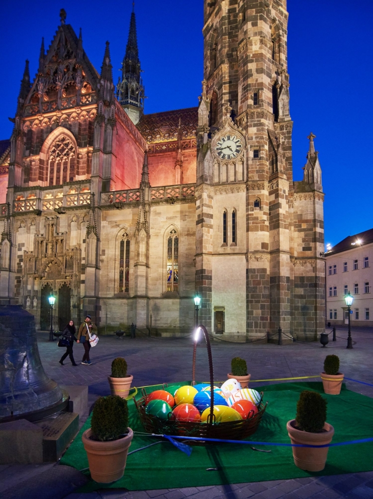 Pohľad na veľkonočný košík, vysoký 2,5 metra, ktorý postavilo mesto Košice pri Urbanovej veži pri príležitosti Veľkej noci. Košice, 27. marec 2016. Foto: SITA/Jozef Jarošík