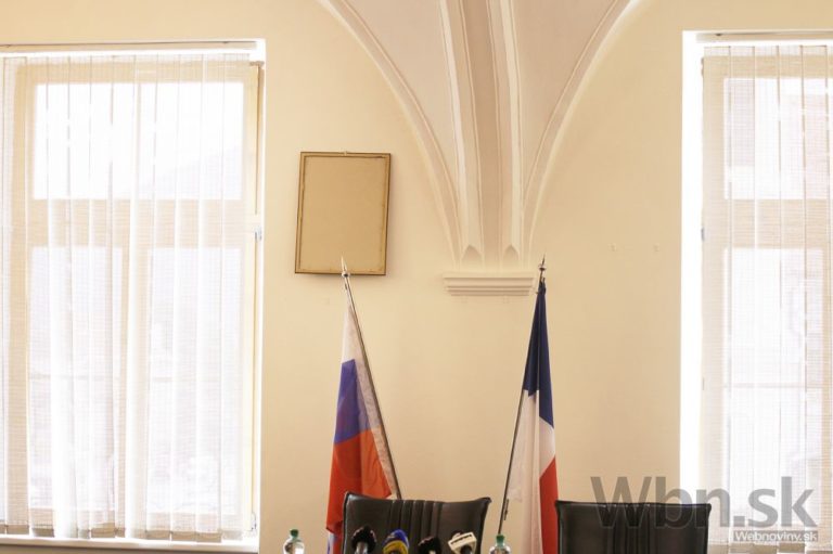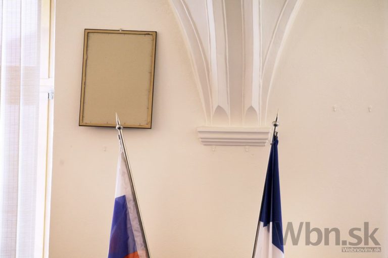 Oficiálny portrét prezidenta Andreja Kisku bol počas tlačovej besedy Mariana Kotlebu otočený naopak. Kotleba sa vyjadroval k situácii vo zvolenskej nemocnici. Banská Bystrica, 7. august 2014. Foto: SITA/Ján Viazanička