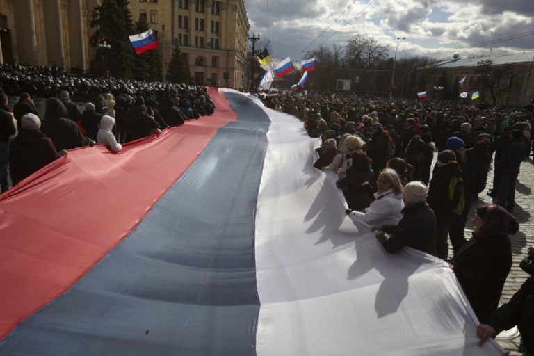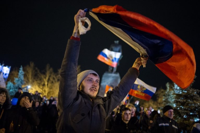 Po vyhlásení neoficiálnych výsledkov na Leninovom námesti v Simferopole odštartovali oslavy. Ľudia mávali ruskými vlajkami, znela ruská hymna a tancovali kozáci. Pripojenie ukrajinského polostrova Krym k Rusku totiž podporilo až takmer 96 percent voličov. Foto: SITA/AP