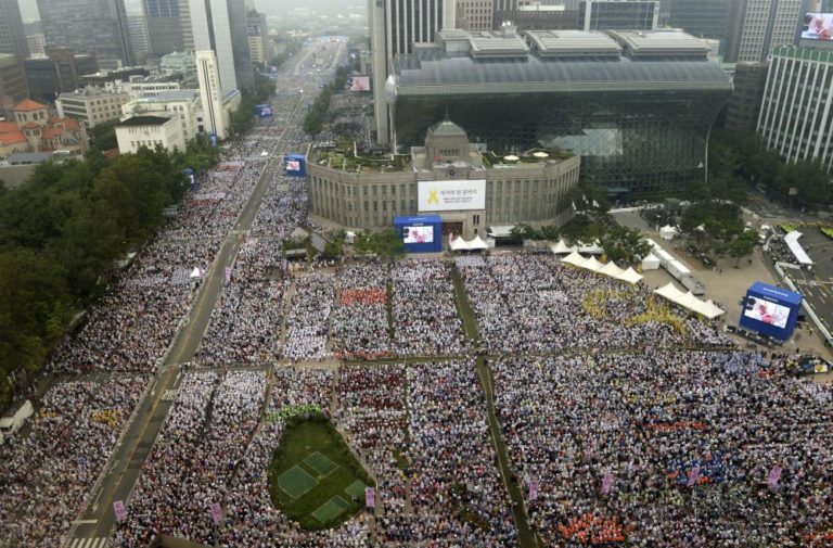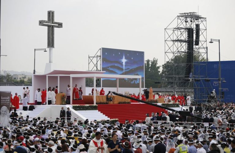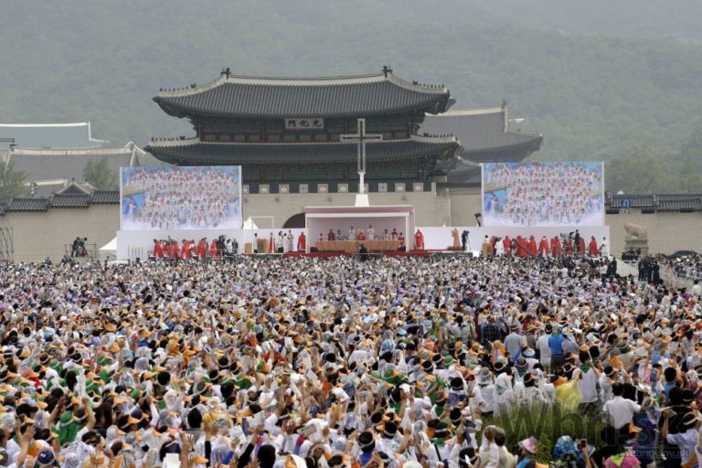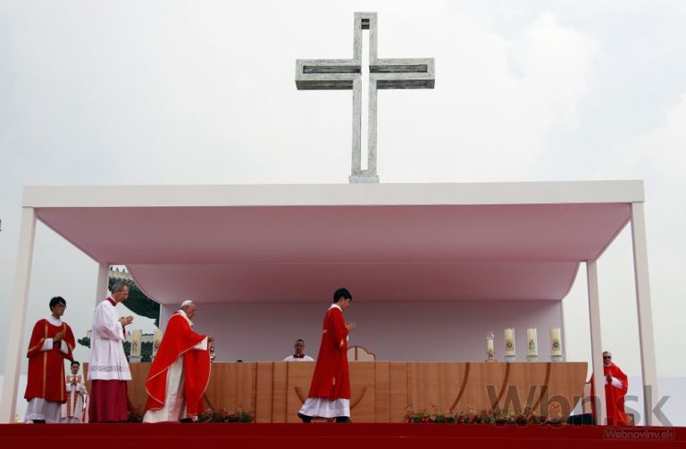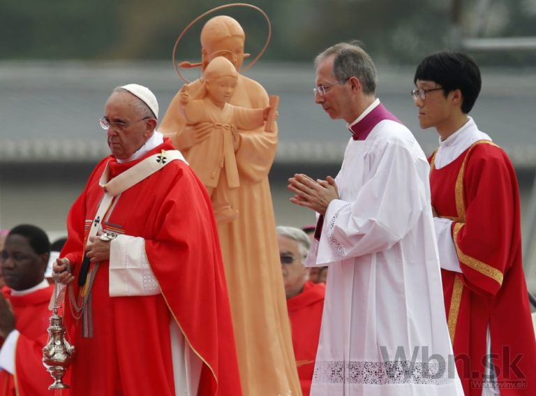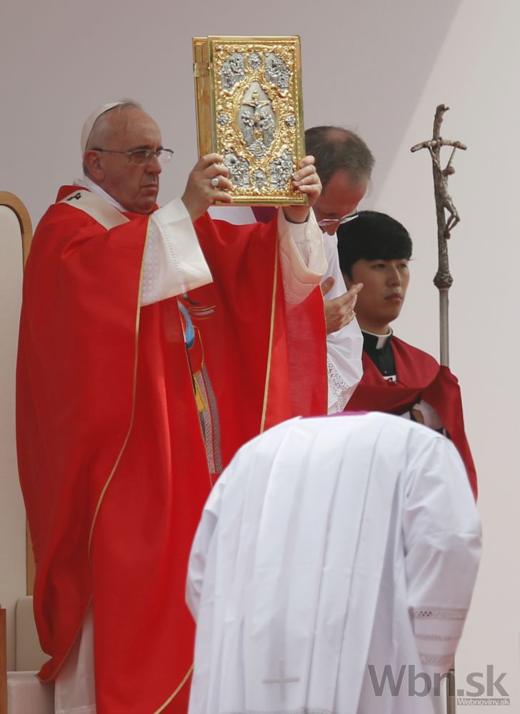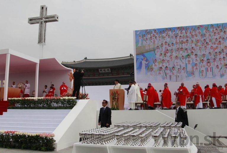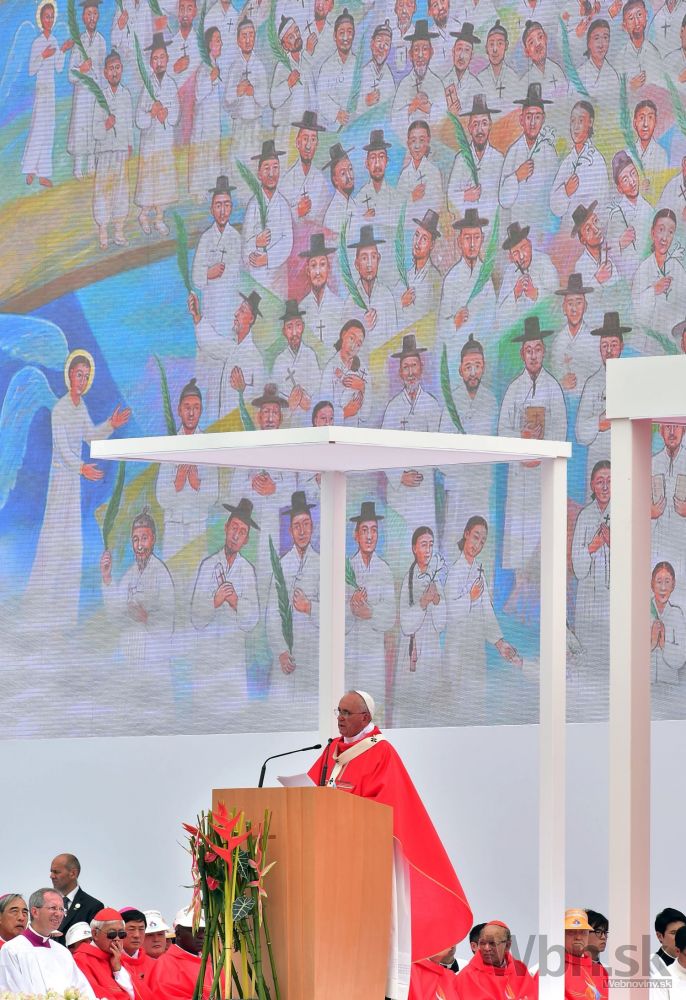 Pápež František v rámci svojej návštevy Južnej Kórey celebroval veľkú omšu pod holým nebom, počas ktorej blahorečil 124 juhokórejských kresťanov. Tí zomreli v 18. a 19. storočí pre svoju vieru. Na sobotňajšej omši v hlavnom meste Soul sa podľa odhadov zúčastnilo až milión ľudí. Uskutočnila sa na tretí deň historickej návštevy pápeža, prvej v Ázii odkedy sa v marci 2013 ujal svojej funkcie. Na bezpečnosť dohliadalo vyše 30 000 policajtov. Foto: SITA/AP