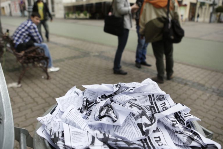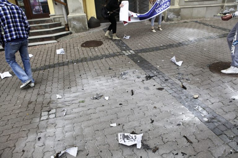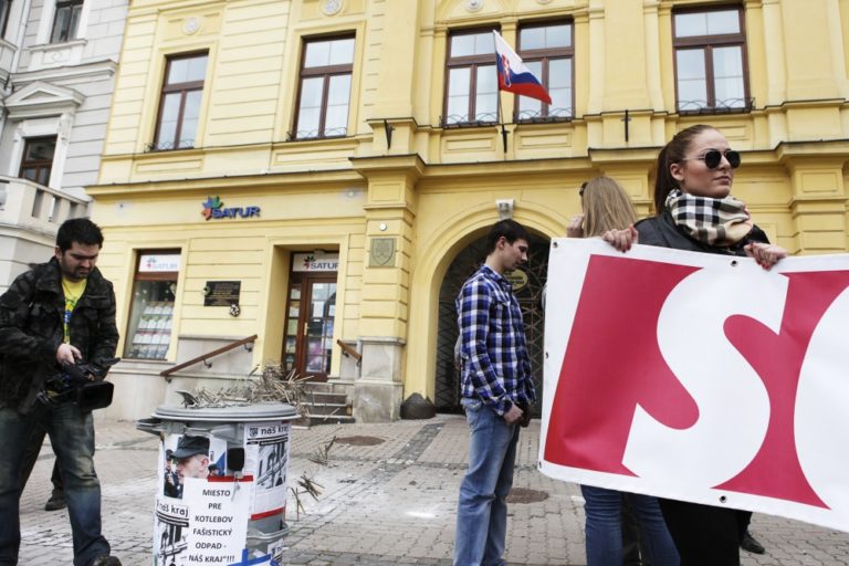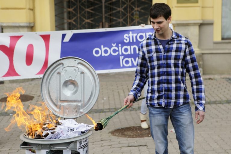 Protestné zhromaždenie Strany občianskej ľavice (SOĽ) pred úradom Banskobystrického samosprávneho kraja (BBSK), ktorého cieľom bola hromadná likvidácia novín s prvkami propagácie fašizmu, mesačníka Náš Kraj. Banská Bystrica, 13. apríl 2014. Foto: SITA/Ján Viazanička