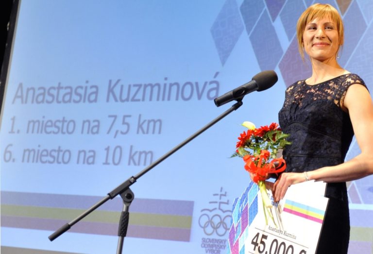 Najúspešnejšia olympionička Anastázia Kuzminová počas slávnostného večera olympionikov organizovaného Slovenským olympijským výborom (SOV). Bratislava, 11. apríl 2014. Foto: SITA/Ján Slovák