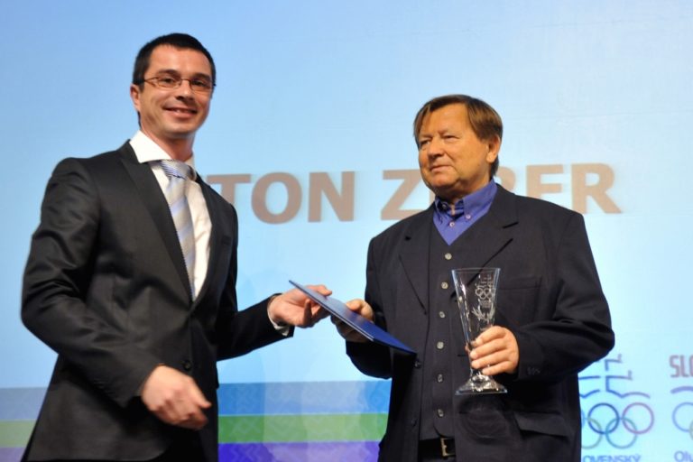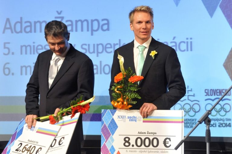 Ocenený Adam Žampa (vpravo) a jeho otec a tréner Tomáš Žampa (vľavo) počas slávnostného večera olympionikov organizovaného Slovenským olympijským výborom (SOV). Bratislava, 11. apríl 2014. Foto: SITA/Ján Slovák