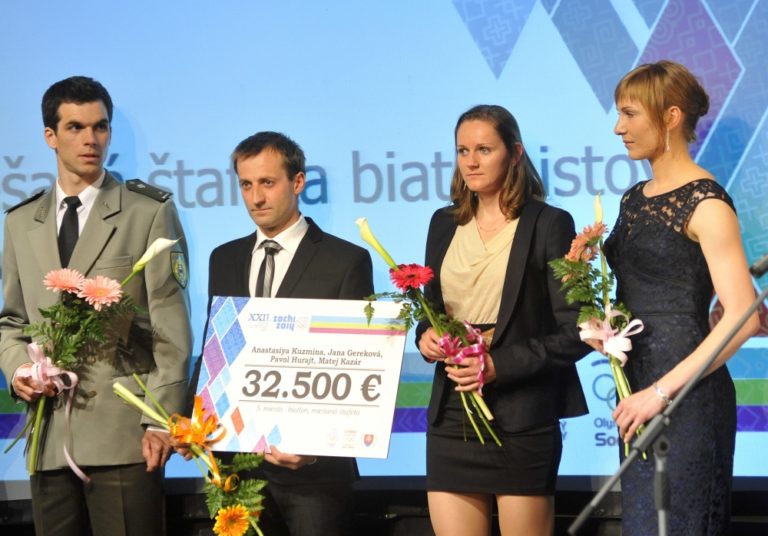 Sprava: Členovia miešanej štafety v zložení Anastasia Kuzminová, Jana Gereková, Pavol Hurajt a Matej Kazár počas slávnostného večera olympionikov organizovaného Slovenským olympijským výborom (SOV). Bratislava, 11. apríl 2014. Foto: SITA/Ján Slovák
