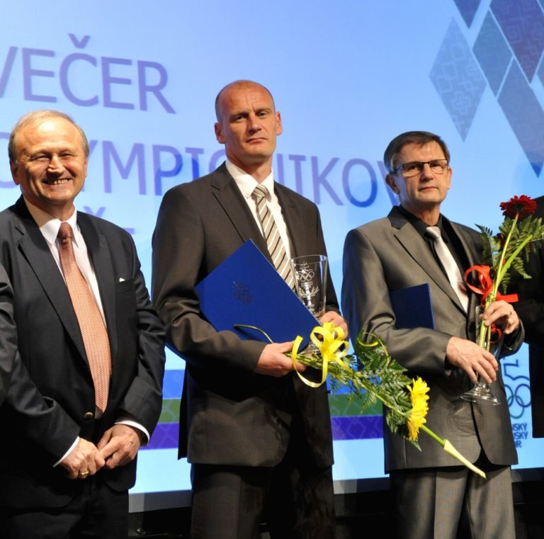 Zľava: Viceprezident Slovenského olympijského výboru Zdenko Kríž, držiteľ Ceny Pavla Demitru za mimoriadny pozitívny prínos k reprezentácii Slovenskej republiky v spojení s vynikajúcimi výkonmi, Miroslav Karhan a držiteľ Ceny Jána Zacharu, boxerský tréner Tibor Hlavačka počas slávnostného večera olympionikov organizovaného Slovenským olympijským výborom (SOV). Bratislava, 11. apríl 2014. Foto: SITA/Ján Slovák