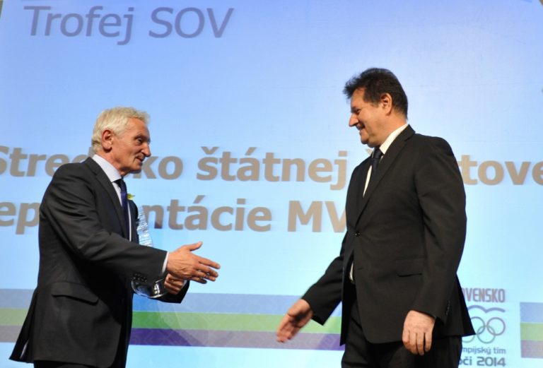 Zľava: Prezident Slovenského olympijského výboru František Chmelár a šéf Strediska štátnej športovej reprezentácie Ministerstva vnútra SR Marián Kukumberg preberajúci Trofej SOV za aktuálny prínos v propagácii olympijského hnutia a prehlbovaní jeho vplyvu na šport, kultúru, výchovu a spoločnosť počas slávnostného večera olympionikov organizovaného Slovenským olympijským výborom (SOV). Bratislava, 11. apríl 2014. Foto: SITA/Ján Slovák