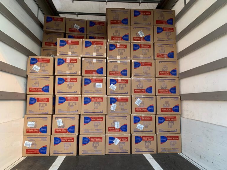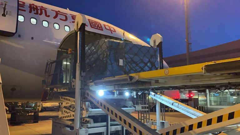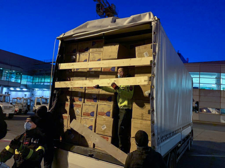 Na Slovensko v rámci boja proti koronavírusu dorazil zdravotnícky materiál a to 2 milióny jednorazových ochranných rúšok zakúpených slovenským rezortom vnútra. Na palube lietadla nachádzal aj dar od súkromnej spoločnosti v podobe ďalšieho pol milióna rúšok, 50-tisíc kusov testerov, 20-tisíc kusov ochranného oblečenia a 25-tisíc kusov ochranných okuliarov. S prepravou materiálu z Činy Slovensku pomohla Česká republika. Bratislava, 24. marec 2020. Foto: SITA/Ministerstvo vnútra SR