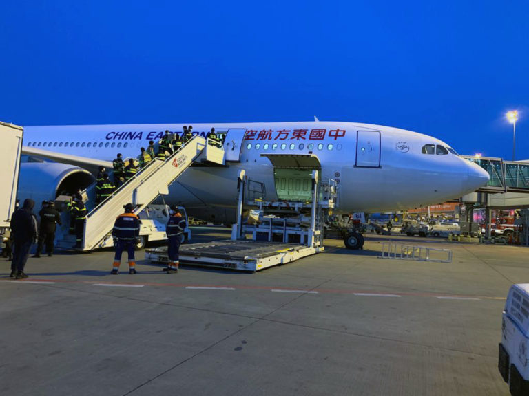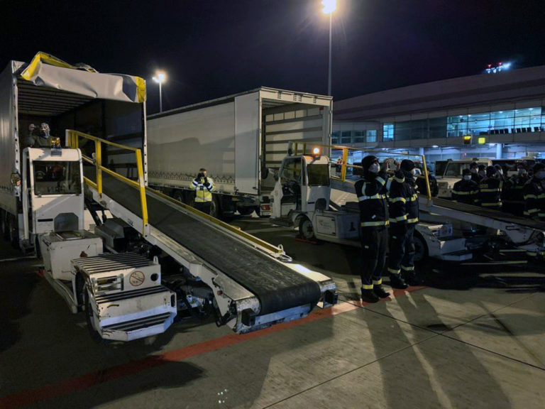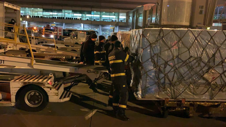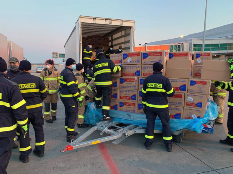 Na Slovensko v rámci boja proti koronavírusu dorazil zdravotnícky materiál a to 2 milióny jednorazových ochranných rúšok zakúpených slovenským rezortom vnútra. Na palube lietadla nachádzal aj dar od súkromnej spoločnosti v podobe ďalšieho pol milióna rúšok, 50-tisíc kusov testerov, 20-tisíc kusov ochranného oblečenia a 25-tisíc kusov ochranných okuliarov. S prepravou materiálu z Činy Slovensku pomohla Česká republika. Bratislava, 24. marec 2020. Foto: SITA/J&T