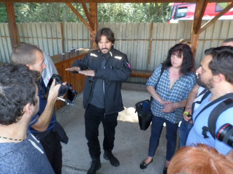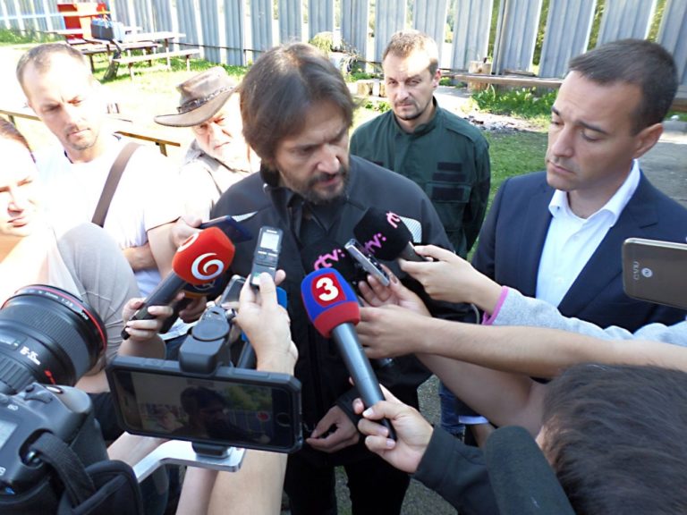 Minister vnútra SR Robert Kaliňák (uprostred) počas stretnutia s novinármi po páde vrtuľníka Bell 429. Záchranársky vrtuľník spoločnosti AIR – TRANSPORT EUROPE (ATE) sa zrútil s trojčlennou posádkou a zranenou osobou v lokalite Bukovina pri obci Strelníky. Haváriu neprežili traja členovia posádky a pacient. Strelníky, 8. september 2016. Foto: SITA/Štefan Plevo