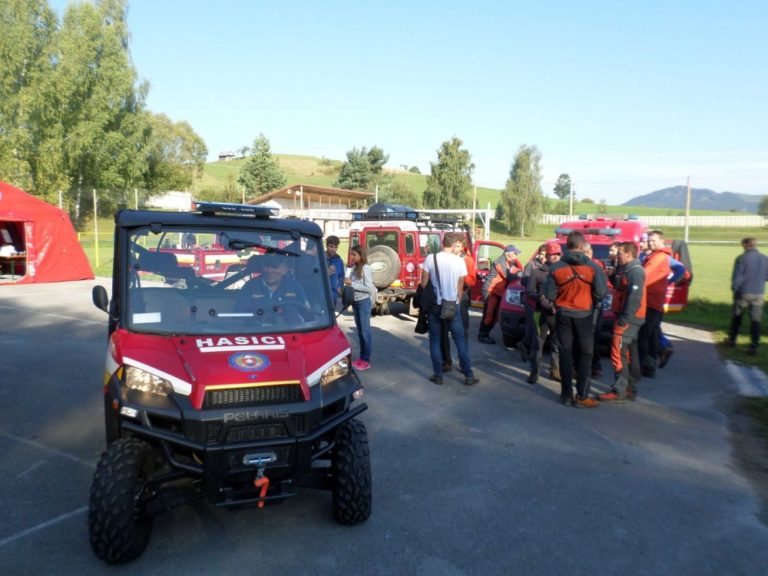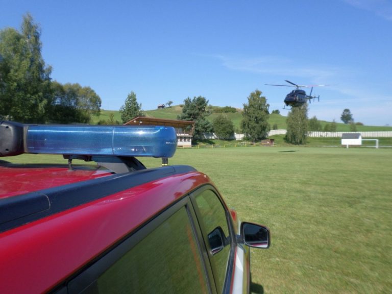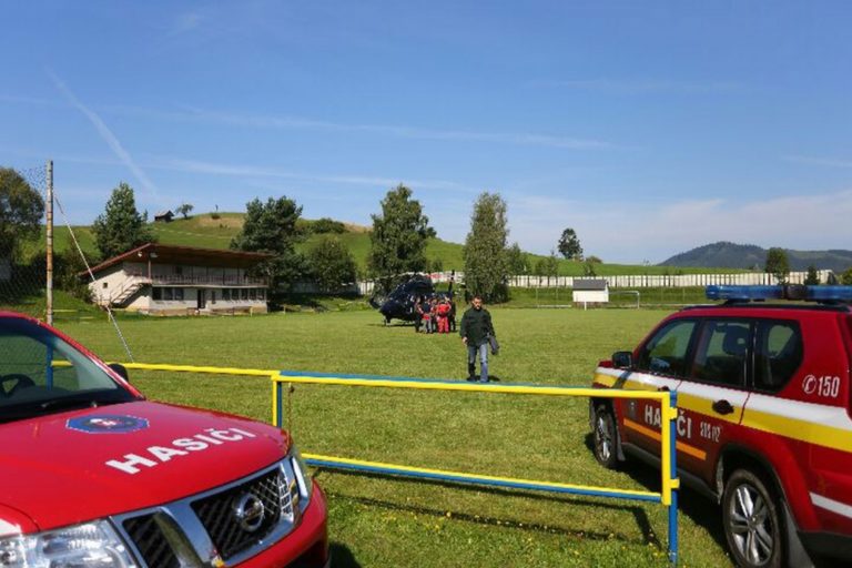 Futbalové ihrisko v obci Strelníky, kde sa rozložili policajné a záchranné zložky zasahujúce po páde vrtuľníka Bell 429. Záchranársky vrtuľník spoločnosti AIR – TRANSPORT EUROPE (ATE) sa zrútil s trojčlennou posádkou a zranenou osobou v lokalite Strelníky pri Banskej Bystrici. Haváriu neprežili traja členovia posádky a pacient. Strelníky, 8. september 2016. Foto: SITA/Peter Rusko
