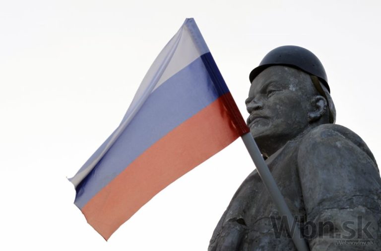 Socha zakladateľa Sovietskeho zväzu Vladimira Iljiča Lenina s vojenskou prilbou a ruskou zástavou neďaleko hranice pri ukrajinskom meste Izvaryň. Ukrajina, 13. septembra 2014. Foto: SITA/AP