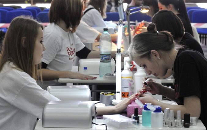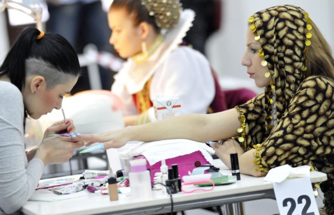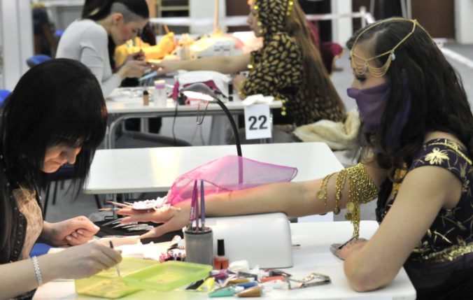 Dizajnérky upravujú nechty počas Majstrovstiev Slovenskej republiky v Nail Designe 2014 v rámci 22. ročníka medzinárodného kozmetického veľtrhu Beauty Forum Slovakia 2014 v trvaní od 20. do 22. marca. Trenčín, 20. marec 2014. Foto: SITA/Tomáš Somr