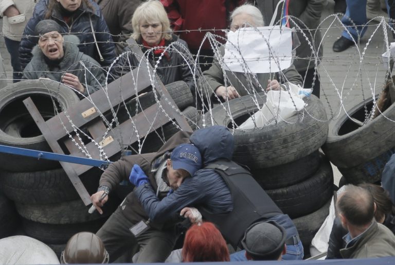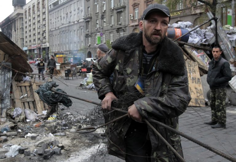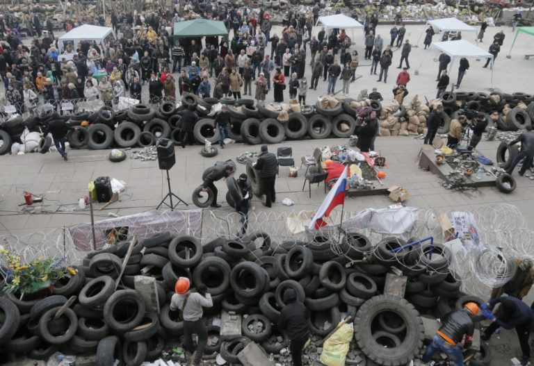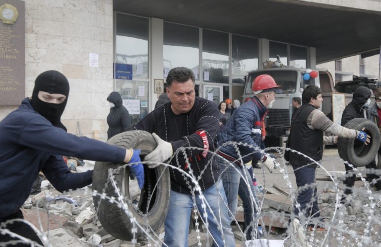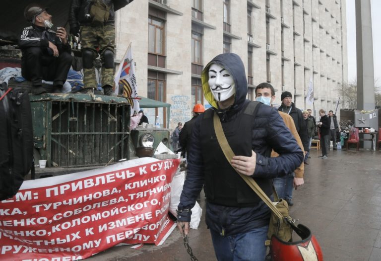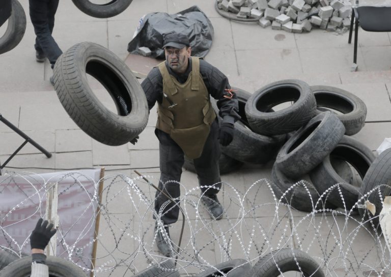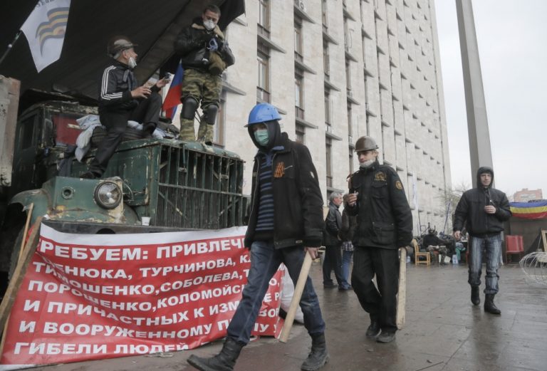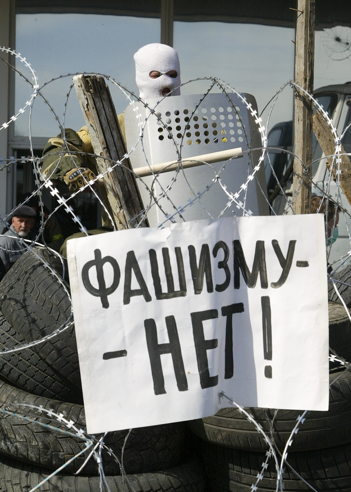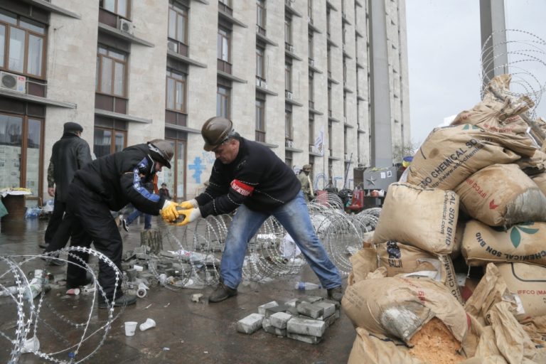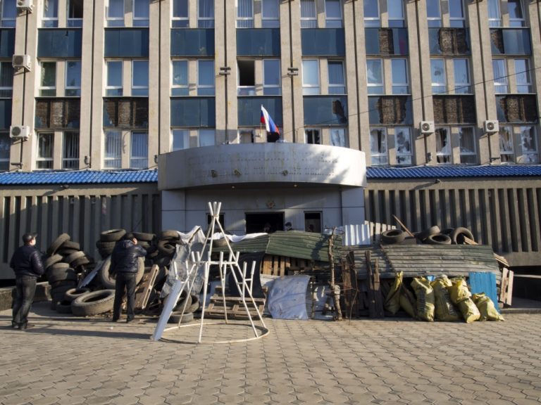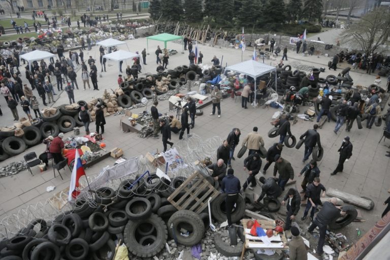 Dočasná ukrajinská vláda dala v stredu proruským aktivistom v Luhansku a Donecku 48-hodinové ultimátum na opustenie štátnych budov, ktoré obsadili cez víkend v súvislosti s požiadavkou na vypísanie referend o pripojení k Rusku, ako tomu bolo v marci na Kryme. Foto: SITA, AP