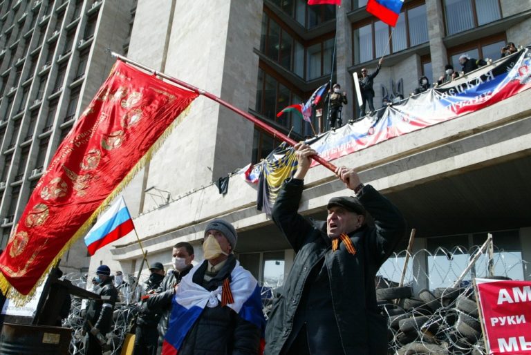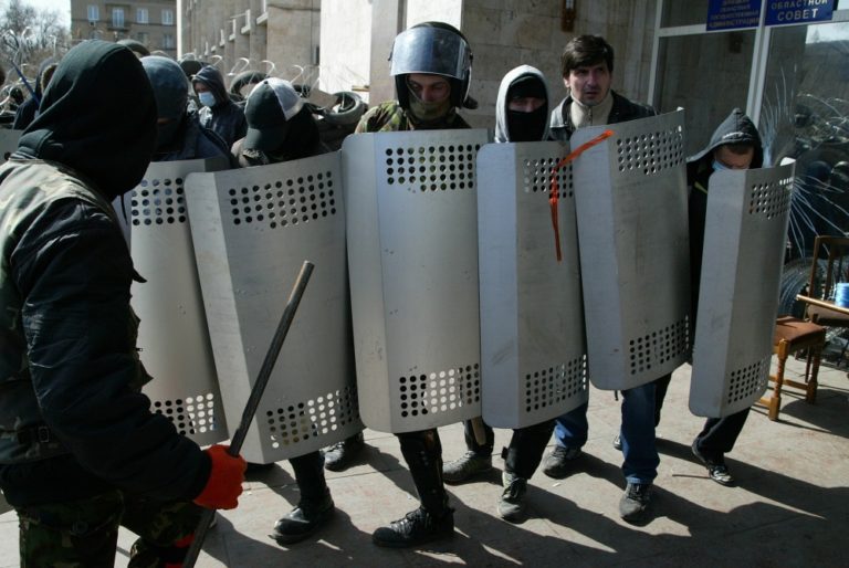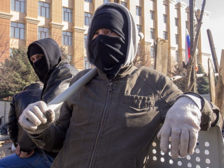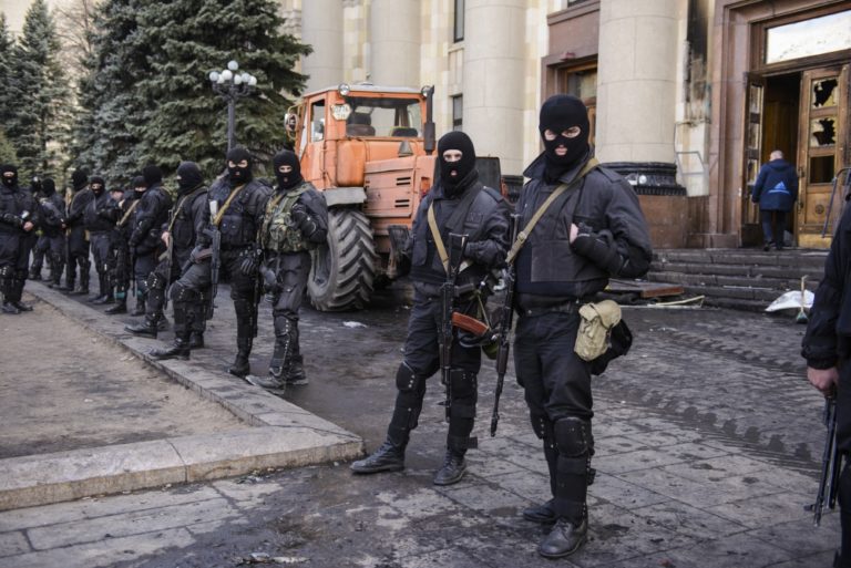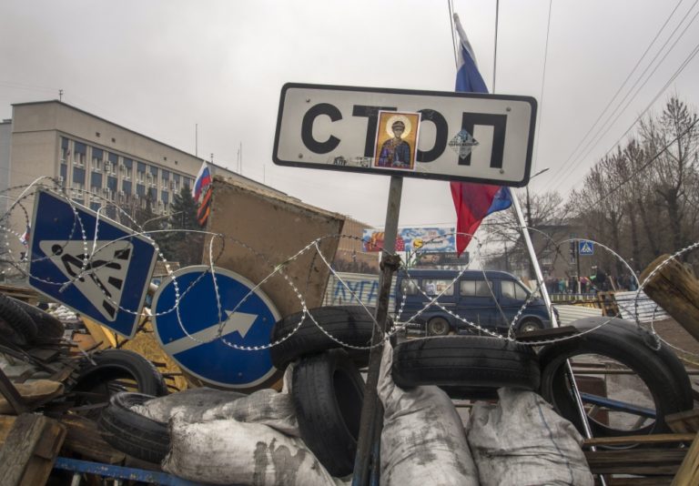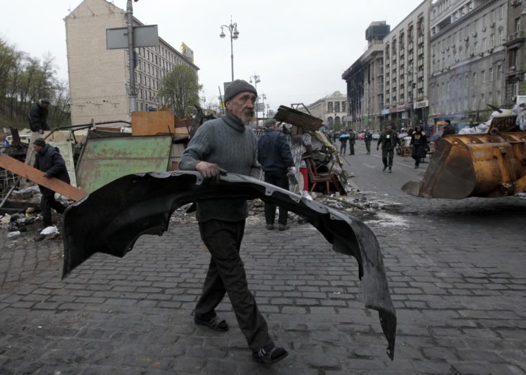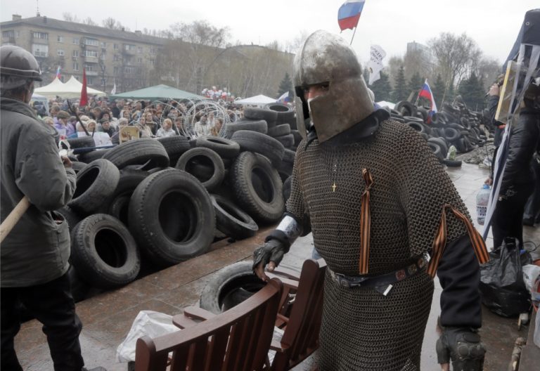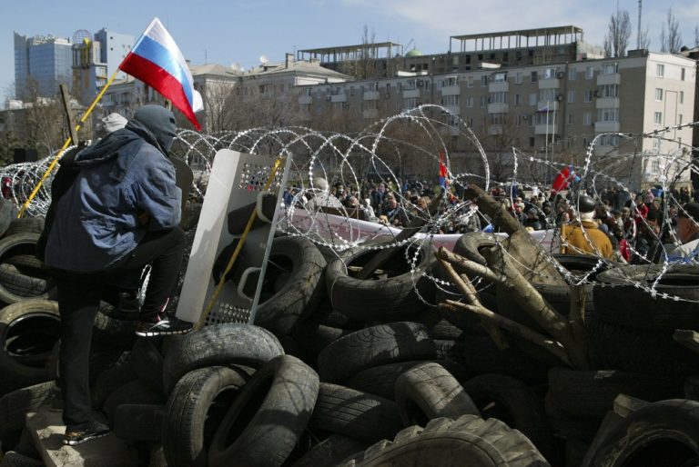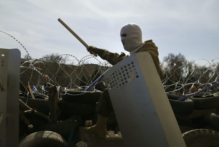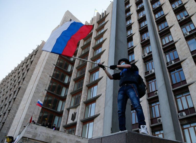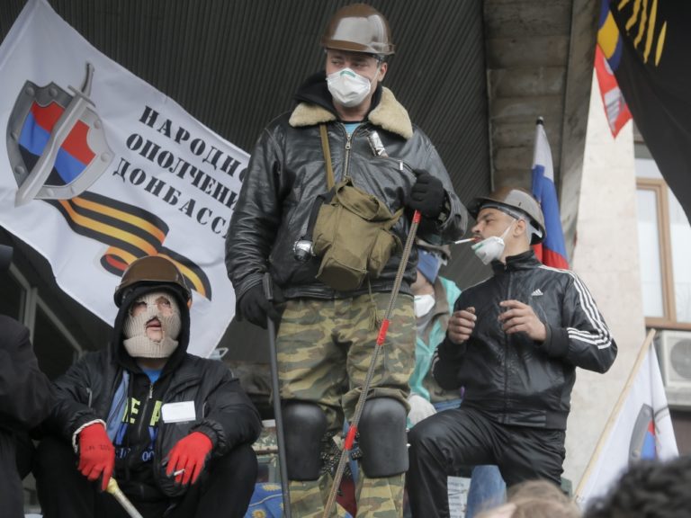 Dočasná ukrajinská vláda dala v stredu proruským aktivistom v Luhansku a Donecku 48-hodinové ultimátum na opustenie štátnych budov, ktoré obsadili cez víkend v súvislosti s požiadavkou na vypísanie referend o pripojení k Rusku, ako tomu bolo v marci na Kryme. Foto: SITA, AP