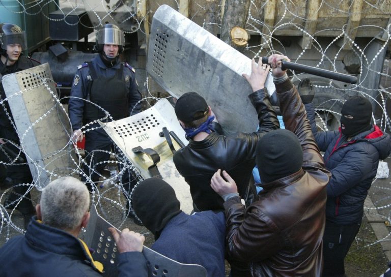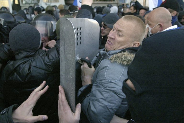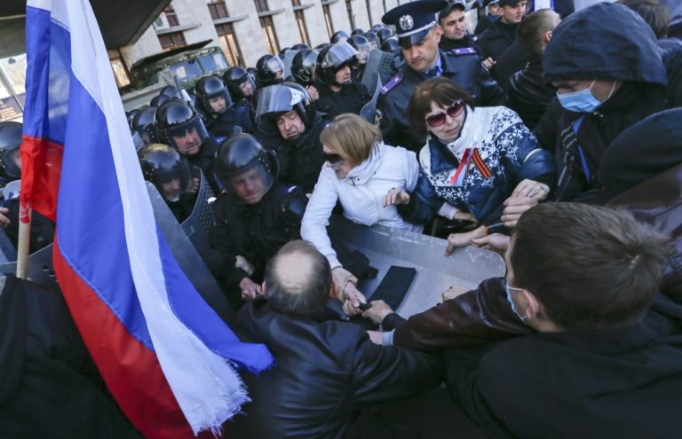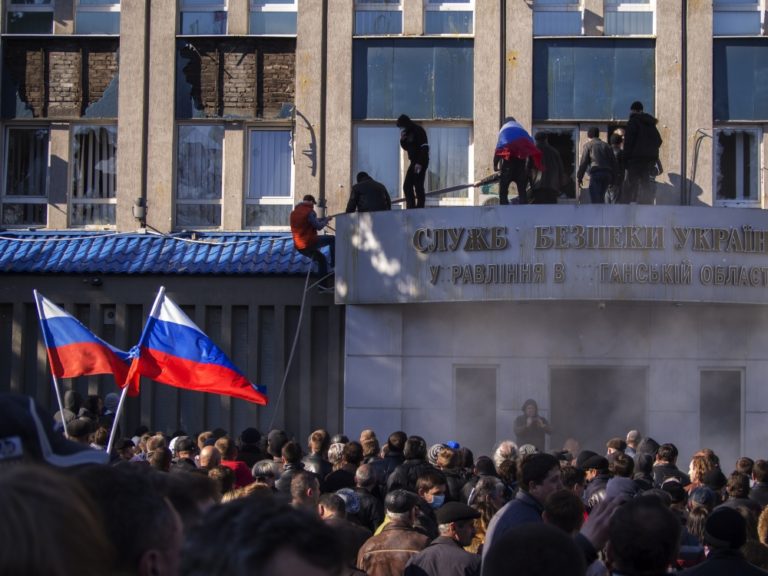 Desiatky demonštrantov obsadili aj kancelárie bezpečnostných zložiek v neďalekom Luhansku, informovali miestne médiá. Foto: SITA/AP