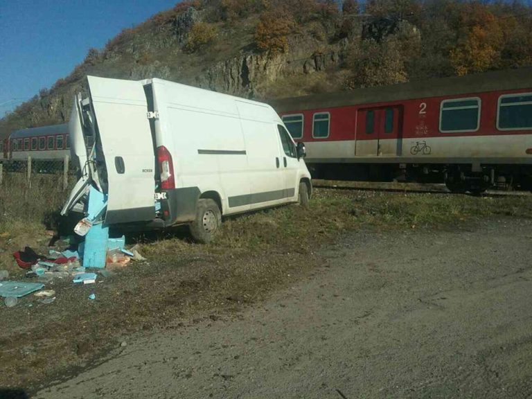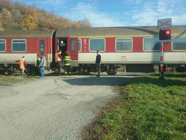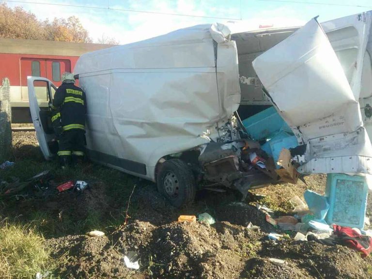 Na železničnom priecestí v Tlmačoch sa zrazila dodávka s rýchlikom, ktorom sa viezlo približne 500 cestujúcich, nikto z nich sa našťastie nezranil. Zranenému vodičovi dodávky poskytli hasiči predlekársku prvú pomoc a odovzdali ho do rúk zdravotníkov. Tlmače, 16. november 2017. Foto: www.facebook.com