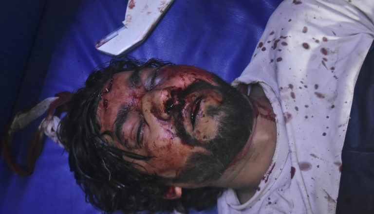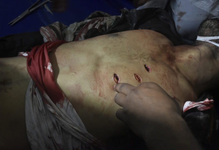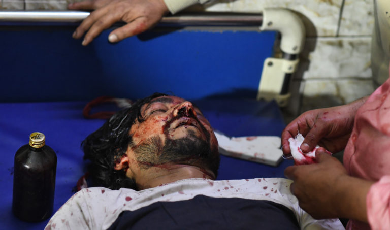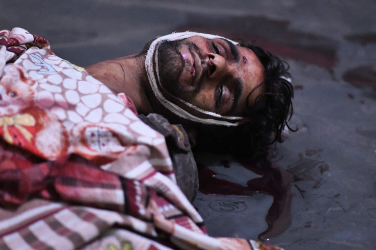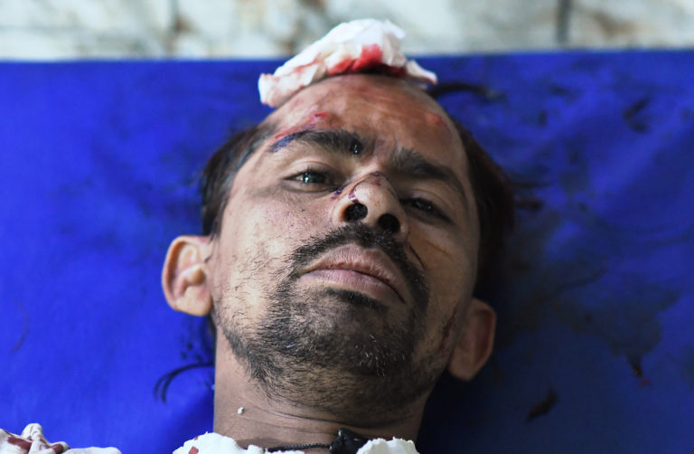 In this Tuesday, Feb. 25, 2020, photo, people attend to a man injured during clashes between Hindu mobs and Muslims protesting a contentious new citizenship law, at Al-Hind hospital in old Mustafabad area of New Delhi, India. The death toll from three days of mob violence rose to 18 on Wednesday, according to a doctor at a hospital where many of the injured were treated. A resident of Mustafabad Rouf Khan, 43, said the mobs were wielding iron rods, bricks and bamboo sticks and attacked the homes of Muslims amid chants of "Jai Shri Ram," or "Victory to Lord Ram," the popular Hindu god of the religious epic "Ramayana. After forcing inside the homes, they went on a rampage and started beating people and breaking household items," said Khan, adding that he and his family had to run out of fear and take shelter inside a nearby mosque that he said was guarded by thousands of Muslim men. (AP Photo/Rohit Lohia)
