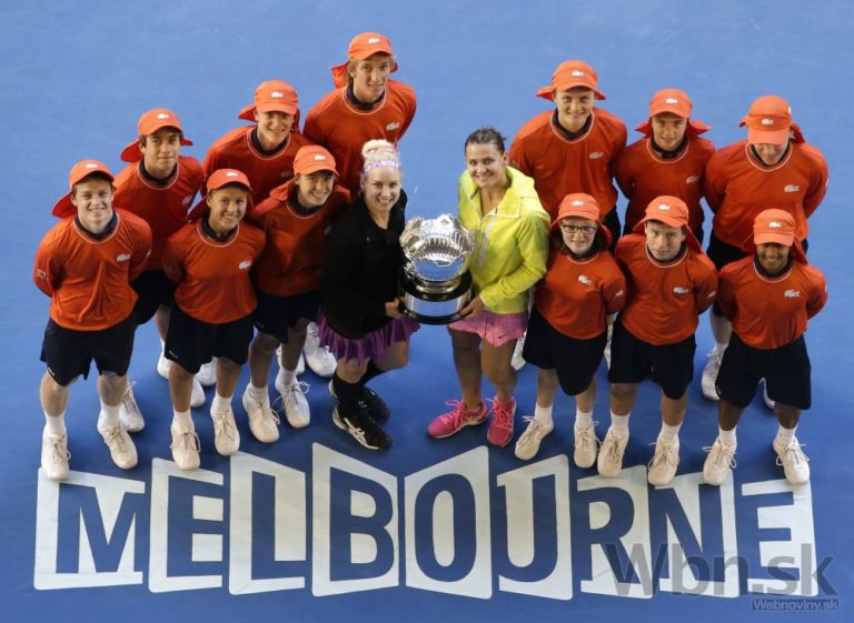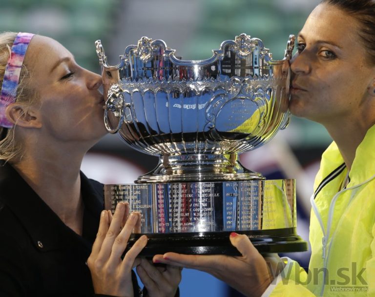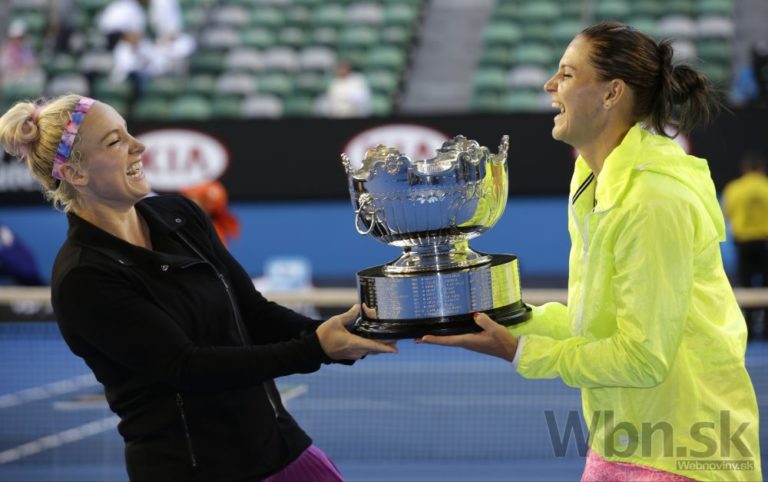 Zľava: Američanka Bethanie Matteková-Sandsová a česká tenistka Lucie Šafářová s víťaznou trofejou po finálovom zápase ženskej štvorhry na Australian Open, v ktorom porazili taiwansko-čínsky pár Čchan Jüng-ťan, Ťie Čeng 6:4, 7:6 (5). Melbourne, 30. január 2015. Foto: SITA/AP
