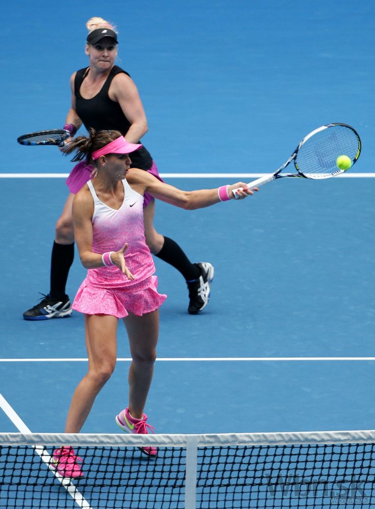 Američanka Bethanie Matteková-Sandsová a česká tenistka Lucie Šafářová (vpredu) počas finálového zápasu ženskej štvorhry na Australian Open, v ktorom porazili taiwansko-čínsky pár Čchan Jüng-ťan, Ťie Čeng 6:4, 7:6 (5). Melbourne, 30. január 2015. Foto: SITA/AP