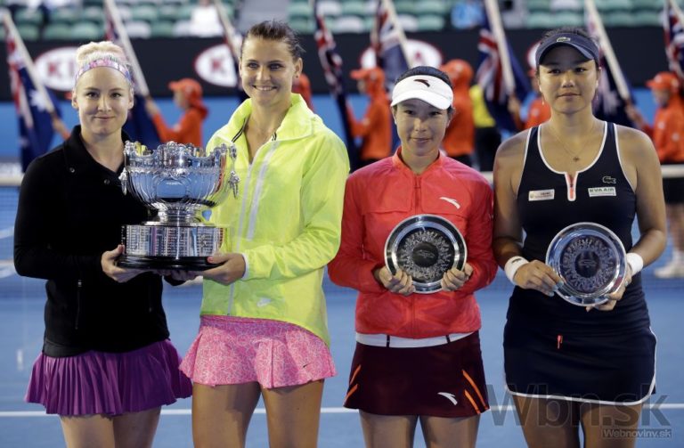 Zľava: Američanka Bethanie Matteková-Sandsová a česká tenistka Lucie Šafářová s víťaznou trofejou po finálovom zápase ženskej štvorhry na Australian Open, v ktorom porazili taiwansko-čínsky pár Čchan Jüng-ťan, Ťie Čeng (vpravo) 6:4, 7:6 (5). Melbourne, 30. január 2015. Foto: SITA/AP