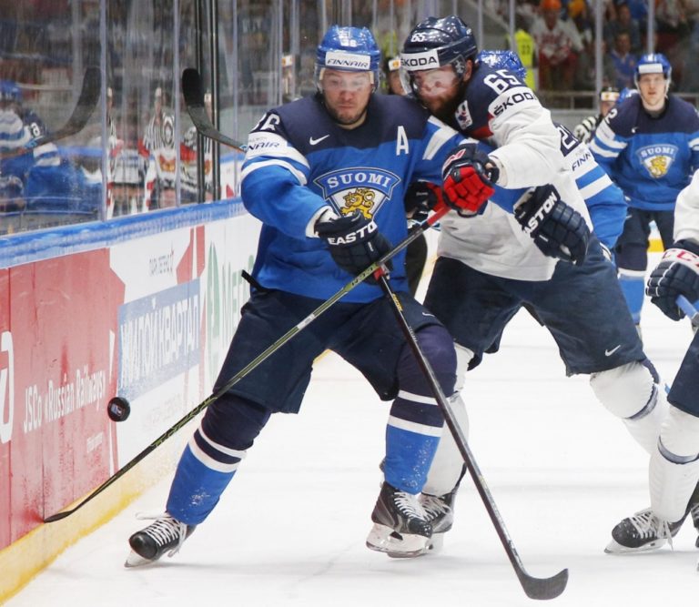 Fínsky útočník Jussi Jokinen v súboji so Slovákom Tomášom Marcinkom počas zápasu na svetovom šampionáte v Rusku. Petrohrad, 15. máj 2016. Foto: SITA/AP