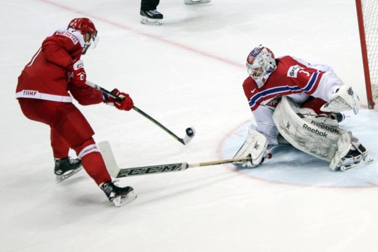 Čech Roman Červenka (vľavo hore) vo veľkej šanci počas zápasu A-skupiny proti Dánsku na svetovom šampionáte v Rusku. Moskva, 15. máj 2016. Foto: SITA/AP