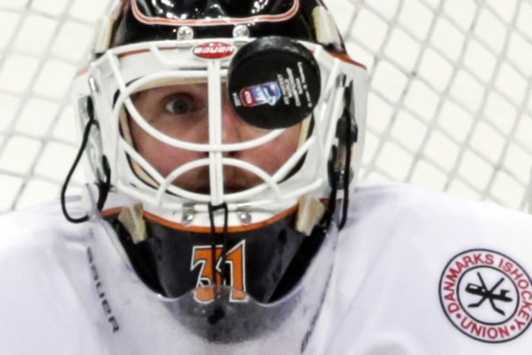 Dánsky brankár Simon Nielsen počas zápasu A-skupiny proti Česku na svetovom šampionáte v Rusku. Moskva, 15. máj 2016. Foto: SITA/AP