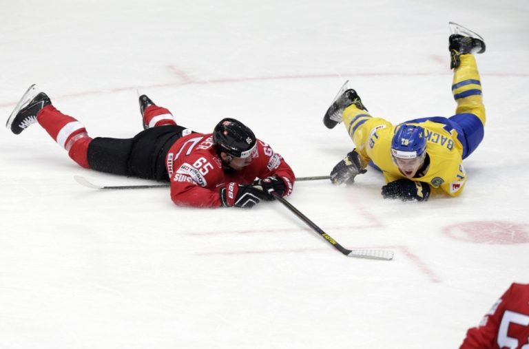 Švajčia Marc Wieser (vľavo) na ľade po súboji so Švédom Mikaelom Backlundom počas zápasu A-skupiny proti Švajčiarsku na svetovom šampionáte v Rusku. Moskva, 15. máj 2016. Foto: SITA/AP