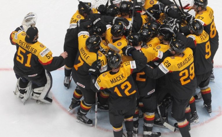 Radosť nemeckých hráčov po výhre nad USA v zápase B-skupiny na svetovom šampionáte v Rusku. Petrohrad, 15. máj 2016. Foto: SITA/AP