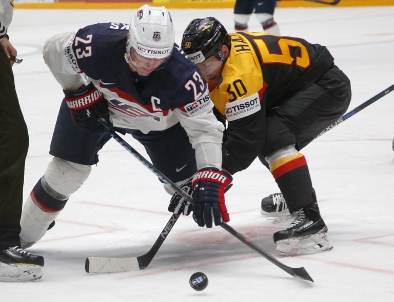 Američan Matt Hendricks (vľavo) a Nemec Patrick Hager na vhadzovaní počas zápasu B-skupiny na svetovom šampionáte v Rusku. Petrohrad, 15. máj 2016. Foto: SITA/AP