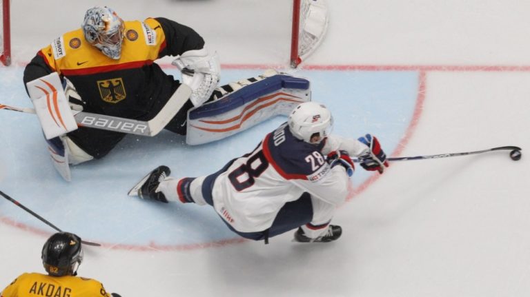 Nemec Patrick Hager skóruje do brány USA počas zápasu B-skupiny na svetovom šampionáte v Rusku. Petrohrad, 15. máj 2016. Foto: SITA/AP