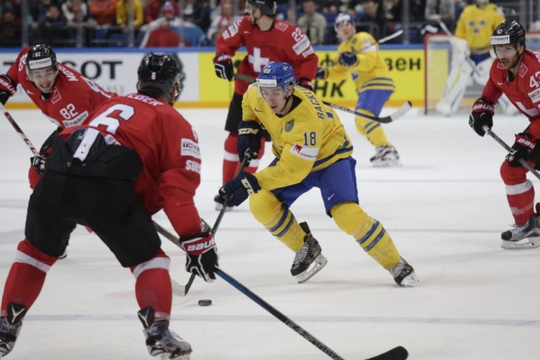 Švéd Mikael Backlund kontroluje puk počas zápasu A-skupiny proti Švajčiarsku na svetovom šampionáte v Rusku. Moskva, 15. máj 2016. Foto: SITA/AP